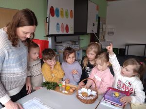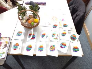 28 marca w Oddziale Dziecięcym Albatrosów odbyły się zajęcia o tematyce wielkanocnej. Dzieci wysłuchały opowiadania pt. „Idzie wiosna, Wielkanoc tuż, tuż…”, omawialiśmy polskie tradycje wielkanocne i przygotowywaliśmy wspólnie koszyczek wielkanocny. Następnie dzieci zrobiły piękne, wyklejane bibułą kartki świąteczne. Po zajęciach odbyło się wspólne śniadanie wielkanocne z rodzicami.